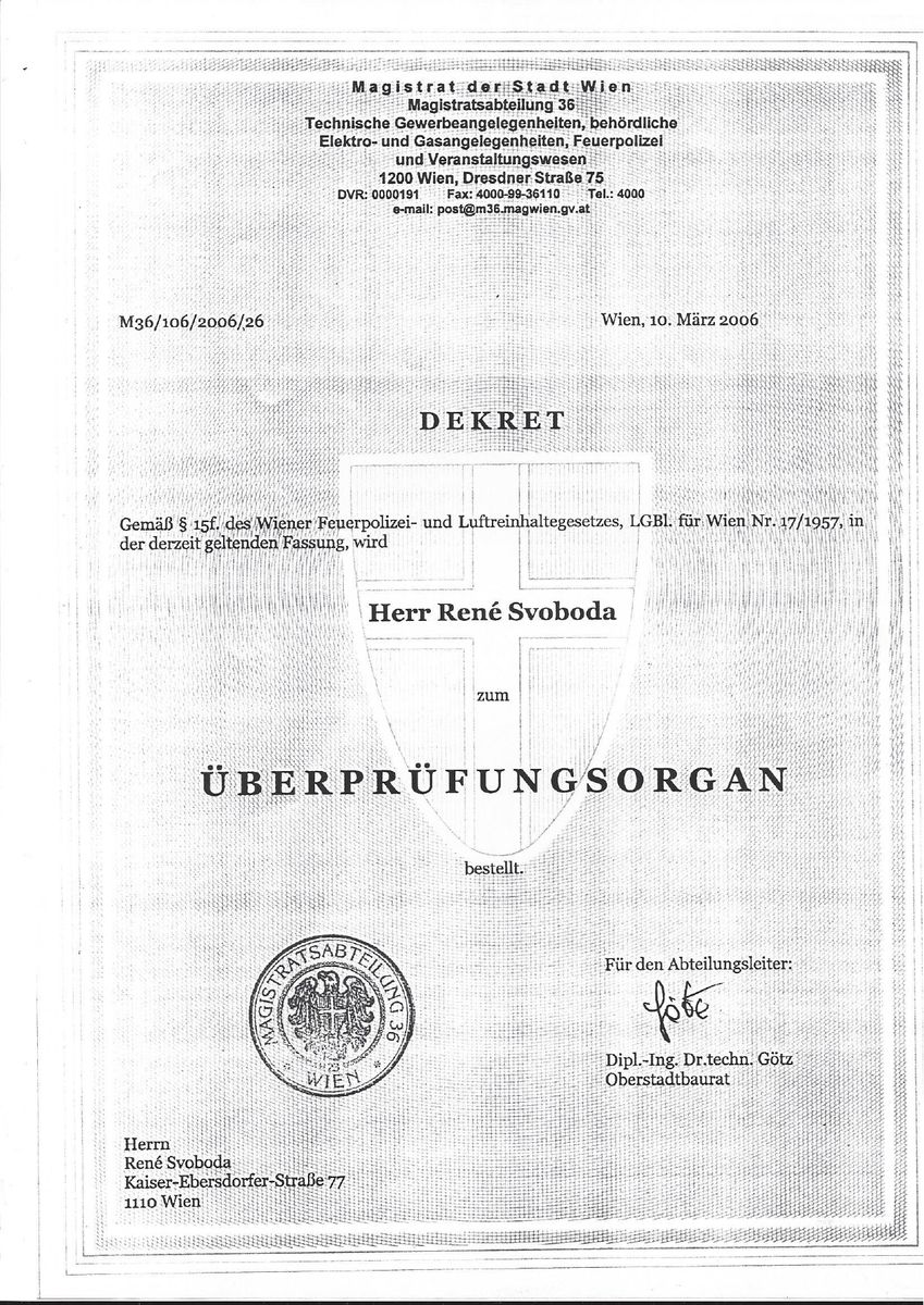 • Zum Überprüfungsorgan Gemäß 15f des Wiener Feuerpolizei und Luftreinhaltegesetz wurde ich im März 2006 bestellt.